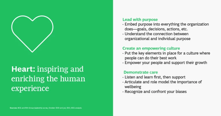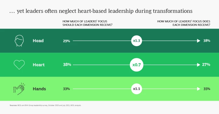 Many organizations mistakenly neglect the heart aspect of transformation. Leading with the heart is the most valuable to employees, but leaders most commonly neglect this dimension. Starting with a purpose and spearheading authentic ESG efforts are foundational to the leading with the heart, both with high impact across people and business results.