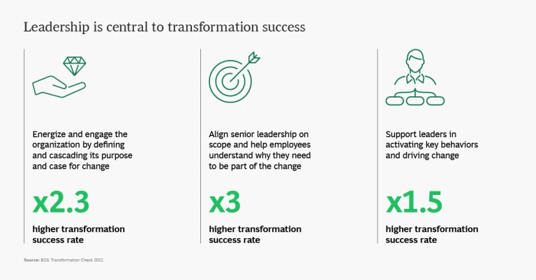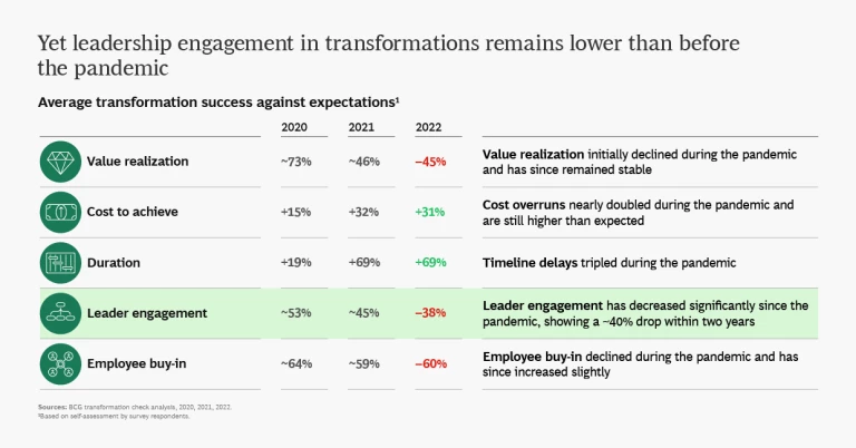 Leadership is central to transformation success. Companies with a systematic and well-supported approach to activate leaders see transformation success rates that are three times higher than those of their competitors. Yet leader engagement has decreased significantly since the pandemic—a drop of roughly 40% in two years.