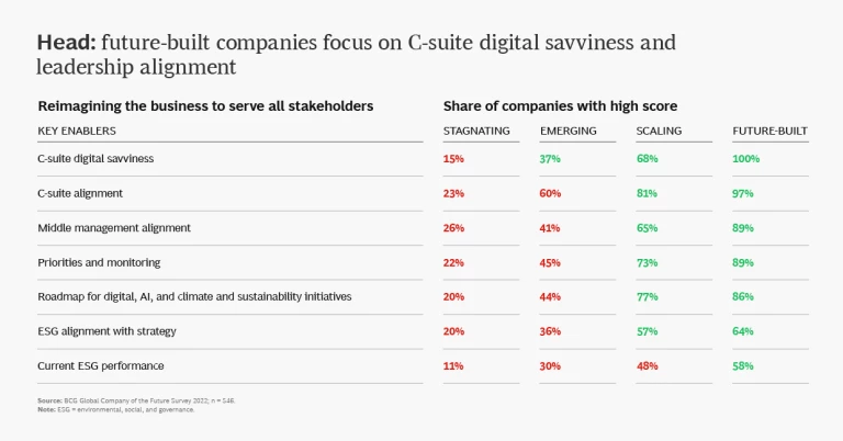 Our survey asked all participants about five areas that are fundamental to success, the emphasis of transformation efforts, how successful they have been, and the degree to which each of more than 50 potential influencing capabilities were in place. We then used the resulting data set to analyze which combination of capabilities, if built sufficiently well, had the biggest impact on future readiness and which combination differentiated future-built organizations from those facing a greater risk of disruption. Six attributes—aligning leadership with a powerful purpose; developing a clear people advantage; instituting an operating model to enable agility, resilience; establishing an innovation-driven culture; migrating to modernized tech platforms; and embedding AI for value in the organization—emerged from this analysis. In our judgment, these six attributes serve as the best descriptors for leading companies.