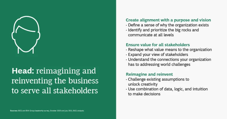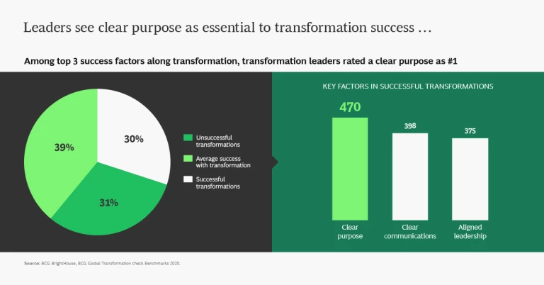 Purpose has power. The key to leadership from the heart and the head begins with a purpose—among the top three success factors for transformation, having a clear purpose ranks first. Purpose aligns every element of the business; it is how employees see themselves as part of something bigger, regardless of their role. Purpose has tremendous impact when done well—companies with a clear purpose have 8% less turnover, a two-fold increase in productivity, and 3.25 times the involvement in transformation initiatives. Perhaps most important: they are twice as likely to have a high TSR.