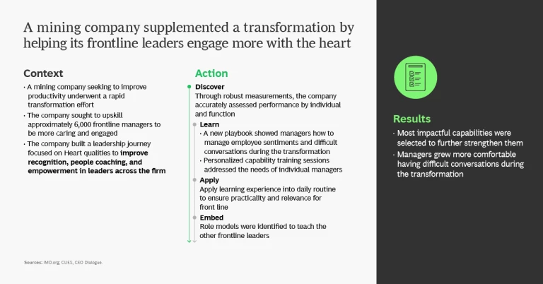 Boosting the performance of frontline leaders. A mining company launched a transformation to improve productivity. Management identified a critical constituency: the roughly 6,000 frontline leaders who directly managed employees. The company built a set of tools related to the heart aspect of transformation to improve recognition, coaching, and empowerment among this group. A playbook gave frontline managers a set of tools to apply, such as how to manage employee sentiment and how to have tough conversations while still remaining empathetic. Individual measurements identified the areas of improvement for individual managers, which the company addressed through personalized learning sessions. That process was replicated at the level of functions and units, leading to a dramatic increase in effectiveness among frontline managers.