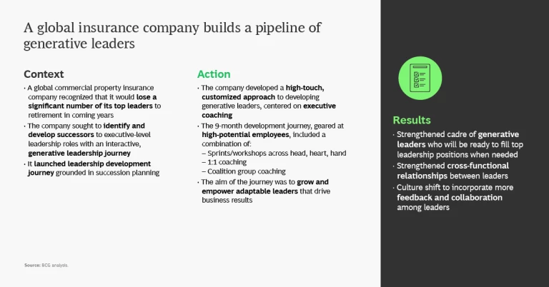A global insurer builds a pipeline of senior leaders. A global commercial property insurer realized that it was on track to lose a significant share of its senior leaders to retirement. In response, it launched a program to identify and train the next wave of C-suite leaders. It launched a nine-month journey, focused on the principles of generative leadership, to grow and empower adaptable leaders that were equipped to drive business results. High-potential employees underwent immersive workshops in head, heart, and hands concepts, along with one-to-one coaching and group sessions with peers. As a result, the firm built a cadre of generative leaders ready to step in as current leaders retire. The company also built a strong culture of feedback, collaboration, and cross-functional relationships among the group.