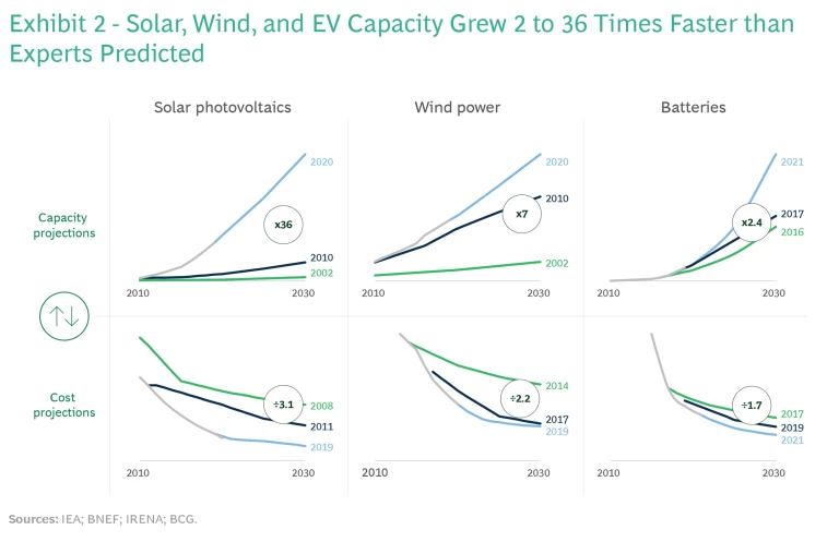 To bake in resilience, companies should also pull in more than one source of data in key topic areas, recognizing that even experts can get things wrong. For example, in June 2022 the International Energy Agency raised its global forecast for renewables growth in what it calls its “largest ever upward revision” for the sector. The agency now forecasts 76% more growth than it did just two years ago. Experts have also consistently underestimated rates of growth in EV batteries, wind turbines, and solar photovoltaics over the past decade. (See Exhibit 2.)