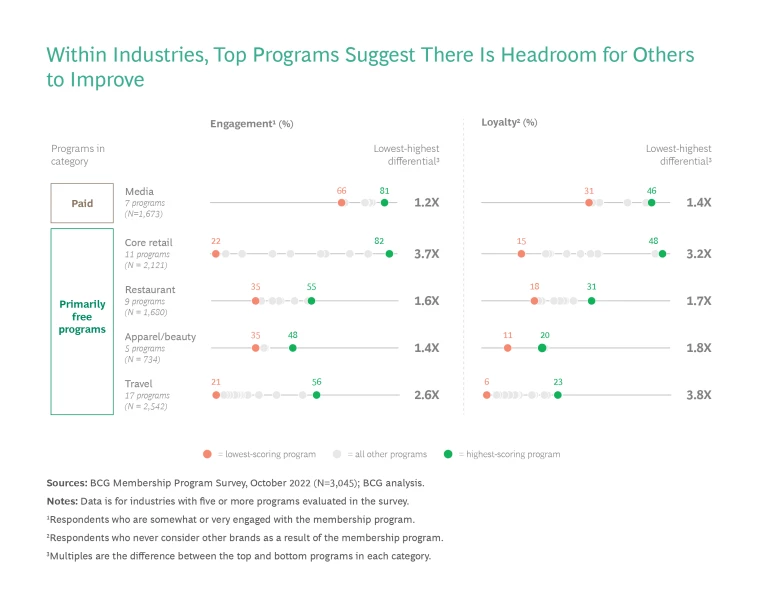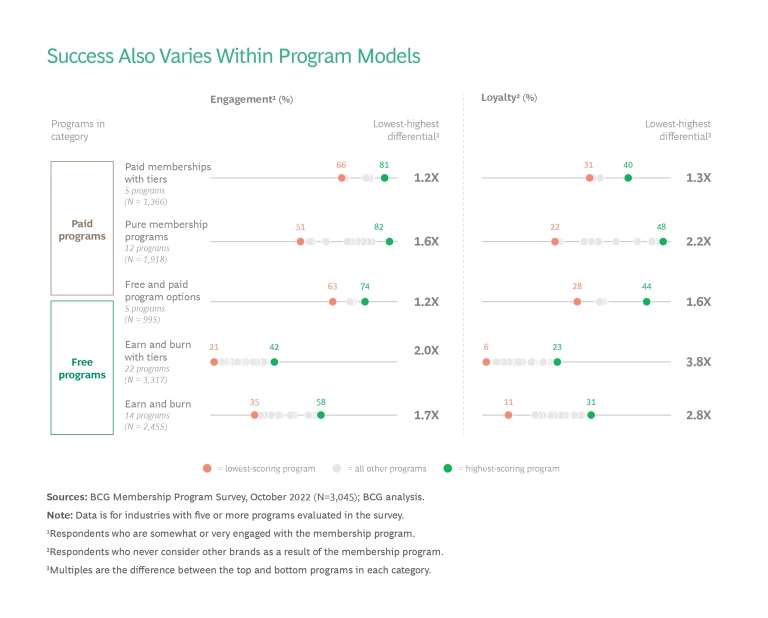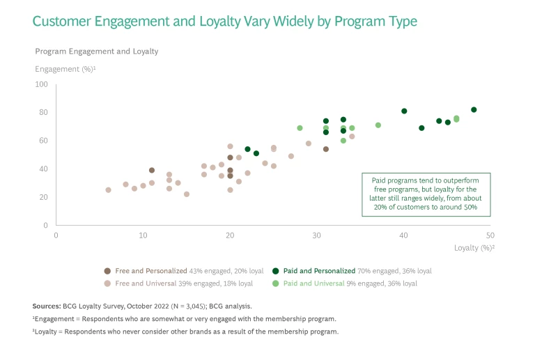 Nonetheless, we find a range of performance results even within paid programs. While fees may be a successful way to engage customers, they also come with a high bar for satisfaction. For a paid program to reach scale and generate meaningful customer engagement, the program has to deliver the benefits it promises and provide perceived value to the customer. If it does not, high attrition rates are the likely outcome.