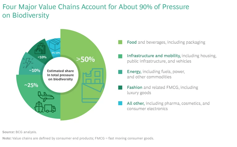 The loss of biodiversity isn’t just a concern for ecologists and others interested in the natural world. Rather, it has real consequences for businesses in virtually every industry. The World Economic Forum has estimated that around $44 trillion—more than half of global GDP—is dependent on high-functioning, healthy biodiversity, which, in turn, is a key component of the ecosystem services that nature provides. These include our food, water, energy, and other resources, as well as the pollination of plants and regulation of the planet’s climate. Biodiversity—and its loss—affects everything from the health of the soil in which we grow our crops to the genetic variety of the food we eat to the value of the biomass that supplies more and more of the energy we use.
