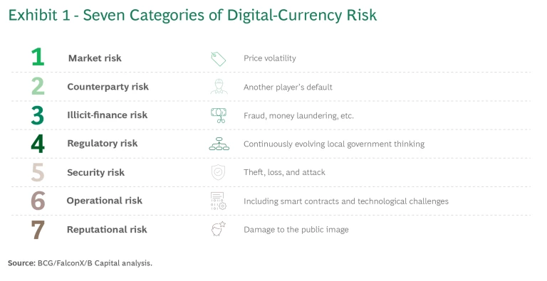 While digital currencies are available in a variety of forms and flavors (see “A Guide to Digital-Currency Products and Services”), they can all be assessed against common risk categories relevant to financial institutions. Exhibit 1 shows these categories arranged roughly in order of the source of risk—from broad market forces to particular actors in the digital-currency ecosystem to gaps in the financial institution’s own range of capabilities.