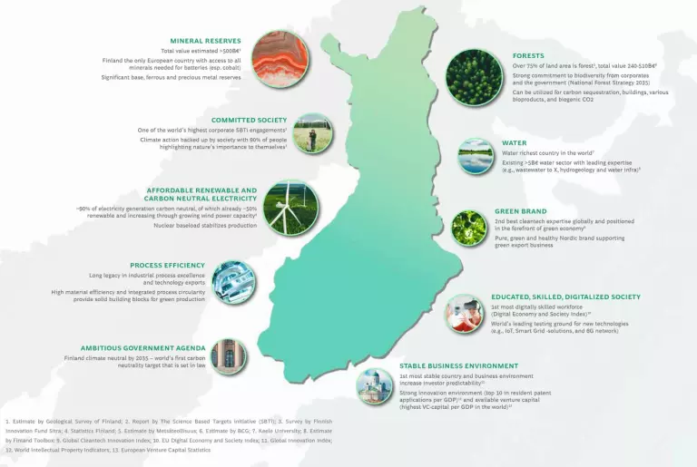 Finland has a unique starting position to be a forerunner in providing green solutions. As tangible sources of competitive advantage, Finland has valuable natural resources for the green transition, including forests (more than 75% of the country's land area is covered by forest)