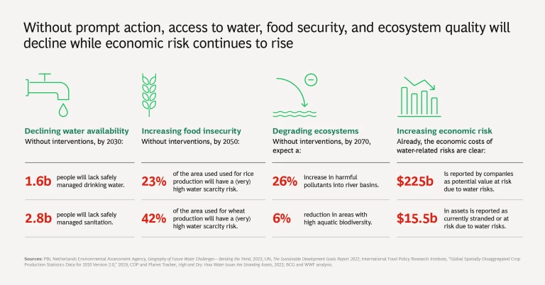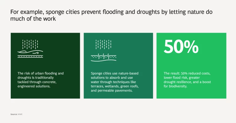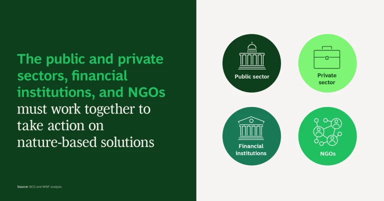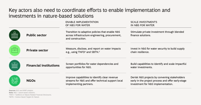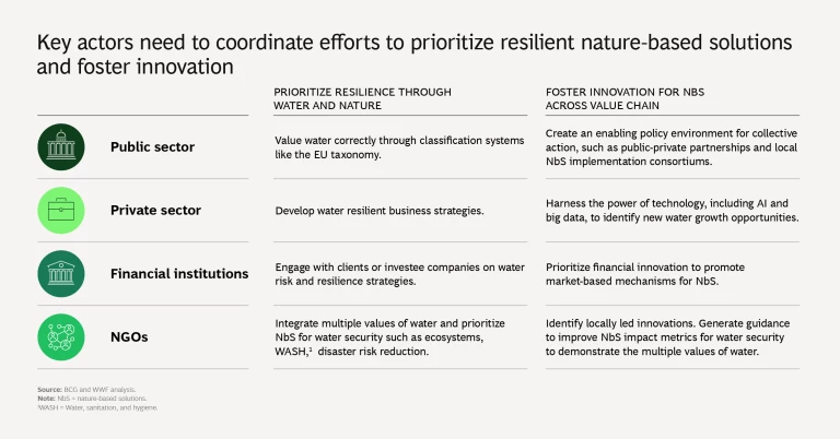For governments, this includes ensuring that water is priced properly and that policies and regulations promote the building and financing of NbS water management infrastructure. Private companies need to make their water practices more resilient across their operations and supply chains while harnessing the power of innovation. Financial institutions need to develop capabilities to assess water-related opportunities and risks—and take these into account in their lending practices and investment portfolios. NGOs can develop and promote global guidance on the need for changes in water management and work with communities and local partners to build new NbS-based infrastructure.
