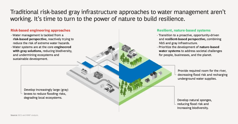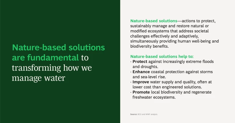 Traditionally, governments and companies have taken a reactive, risk-based approach to water management, one that focuses on mitigating the economic consequences of floods and droughts but pays little consideration to environmental impacts. Now is the time to change this outdated approach to water management by investing more in the power of nature-based solutions (NbS), which protect and enhance ecosystem services, to help manage water with resilience and for the long term. Technological innovation, supportive water governance mechanisms and economic policies, more efficient water operations, and traditional infrastructure and nature-based solutions all have their roles to play in improving how societies manage water. This article focuses on learning to combine traditional solutions for water management with nature-based solutions to ensure safe, secure water supplies for all.