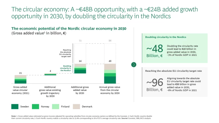 Today, 6% of the Nordic region’s economy is circular—meaning that ~6% of resources used for production come from recovered materials. By comparison, the EU average is at ~12% circularity, with an ambition to double the rate by 2030. Reaching this ambition in the Nordics could unlock an annual ~€48 billion economic opportunity by 2030, similar to 3% of the Nordic region’s GDP in 2021.