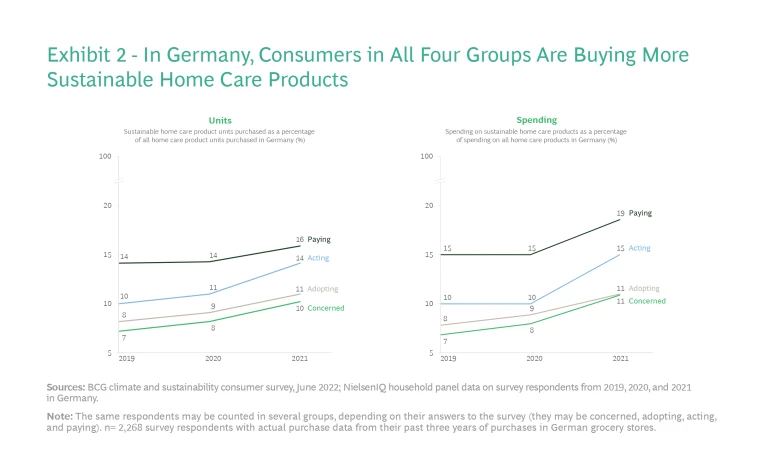 In our most recent research, we not only examined the reported behaviors and motivations of customers, but also used NielsenIQ data to analyze the actual grocery purchases of these same customers at retailers in France and Germany to establish a more definitive link between what they said and what they did. This analysis confirms that the “say-do” gap is real, as there are noticeable differences in purchasing behavior among the four groups. (See Exhibit 2.) A second finding is more encouraging: over the past three years, customers in all four groups have been steadily purchasing more sustainable products. Now companies must find ways to accelerate the trend, close the say-do gap, and drive green into the mainstream by identifying and lowering barriers to sustainable choices.