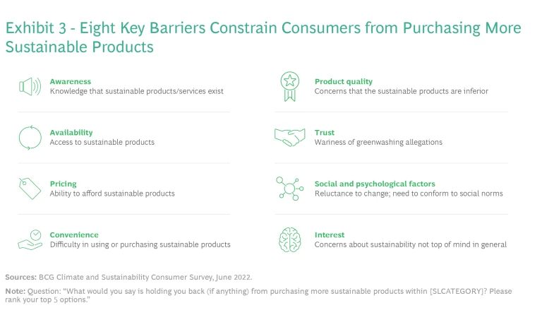 On the basis of our original global research, we have identified eight key barriers to sustainable choices that span industries and markets. (See Exhibit 3.) Overcoming these impediments requires a deep understanding of customer needs that drive choices—and the degree to which customers perceive sustainable products as delivering on these emotional and functional needs, with or without a required tradeoff.