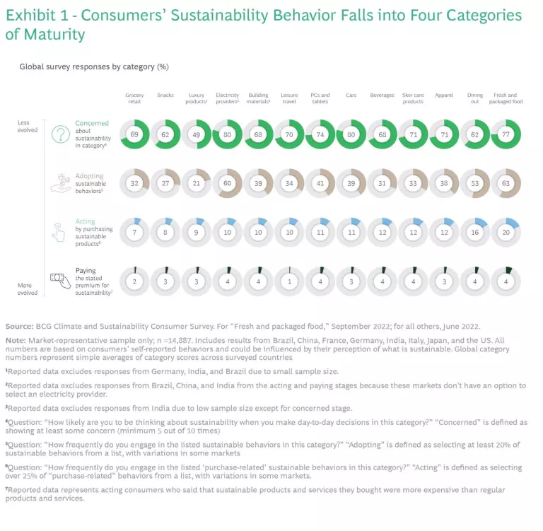 In previous research, BCG measured customer attitudes and behavior toward sustainability across four groups—concerned, adopting, acting, and paying—and found big gaps between the first group (what customers say concerns them) and the other groups (their actual buying behavior). (See the sidebar, “Methodology.”) For example, while 69% of survey respondents expressed concern about sustainability in the grocery retail category, only 7% were actually buying sustainable products. (See Exhibit 1.)