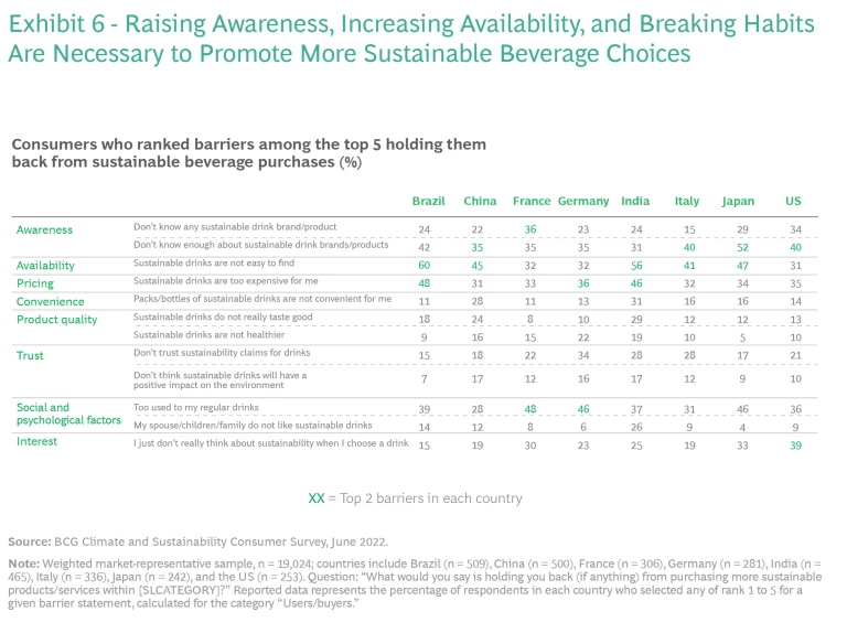 Almost half of French, German, and Japanese customers admit to a psychological block—to being “too used to their regular drinks” to move to more sustainable ones. (See Exhibit 6.) The desire for social conformity is, not surprisingly, another important driver of behavior. For example, 26% of Indian customers said that a major reason for not trying sustainable drinks is that their “spouse, children or family do not like sustainable drinks.”