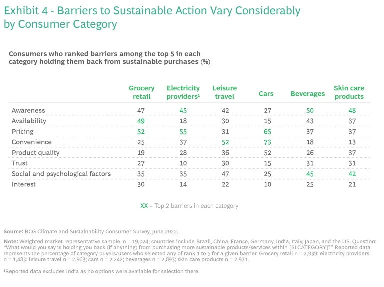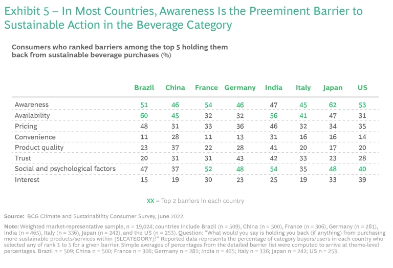 Digging even deeper into the data for beverages, we found a pervasive social and psychological barrier across countries and industries. Globally, 45% of customers said that this barrier was holding them back from sustainable choices. Clearly, old habits die hard. The kind of beer people drink while watching sporting events and the kind of coffee they drink each morning become deeply entrenched and difficult to change even when they want to do so.