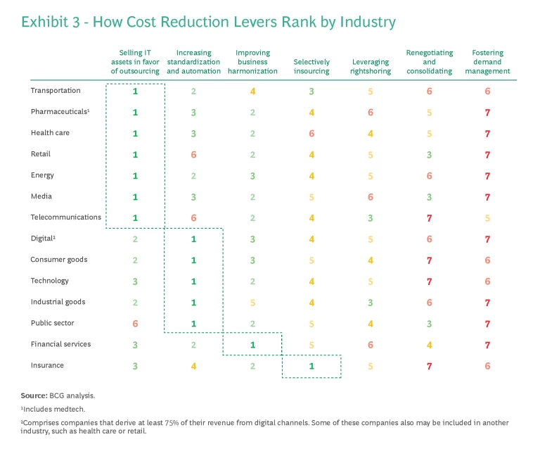 But when we looked at cost reduction levers, we saw notable differences among industries. (See Exhibit 3.) Selling off IT assets (such as data centers and captive delivery centers) and turning to third parties to provide these services was the top priority for the transportation, pharmaceutical, health care, retail, energy, media, and telecommunications industries. By contrast, increasing IT standardization and automation took the top spot for the public sector, as well as the technology, digital, consumer goods, and industrial goods sectors. (The digital industry comprises companies that derive at least 75% of their revenue from digital channels. Some of these companies also may be included in another industry, such as health care or retail.)