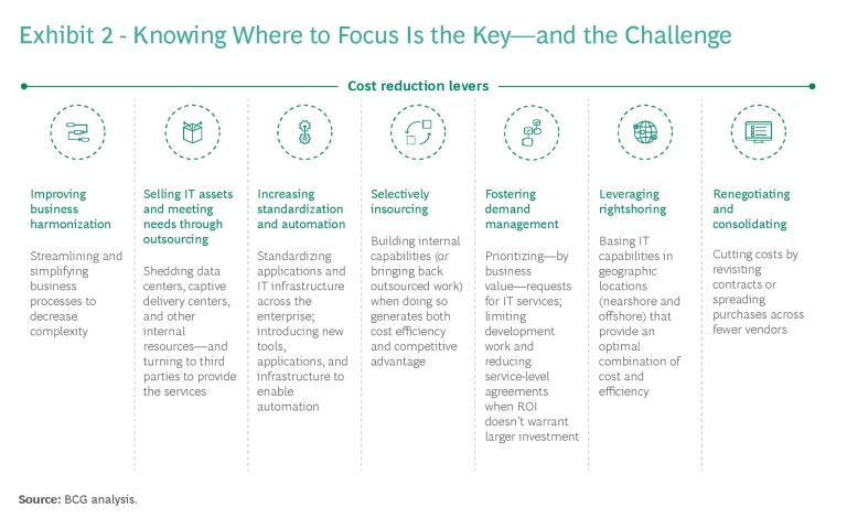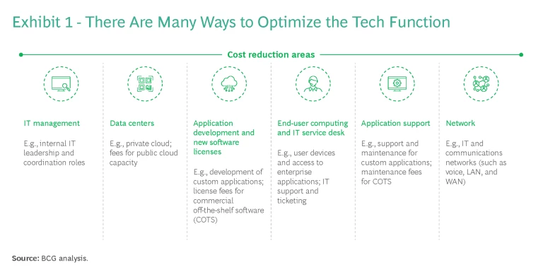 Identifying where to focus is both the key and the challenge when optimizing the tech function. Companies can target different areas for cost reduction: IT management, data centers, app support, to name a few. (See Exhibit 1.) They can apply an array of cost reduction levers, such as selling off IT assets, increasing automation, and renegotiating sourcing contracts. (See Exhibit 2.)
