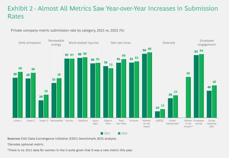 In the EDCI’s first year, more than 80% of portfolio companies submitted data for the majority of the EDCI’s mandatory metrics—which companies were required to submit if they had them. This year has seen continued progress; the number of companies submitting mandatory data increased by an average of 3 percentage points. This suggests that, in its second year, the EDCI continues to be instrumental in encouraging the collection and tracking of consistent ESG metrics.