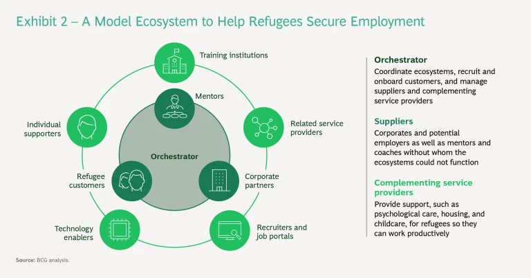 Companies offering suitable job opportunities and the mentors and coaches supporting the placement process will be key suppliers. (See “How Employers Can Support Refugees.”) Others that enhance the support ecosystem’s value are the complementing service providers, such as educational and training companies, which must support the refugees to boost their prospects.