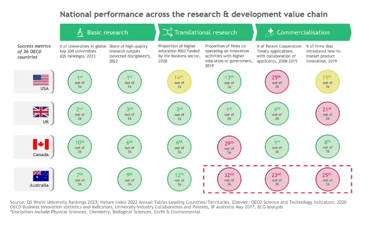 Common problems driving these low rankings include lack of integration of subject matter experts; low availability of commercialisation support; and blunted financial and reputational incentives for individuals, faculties, or universities to commercialise research out of their labs. This lack of capability leads to wasted opportunity for commercialisation and to the benefits of Australian research being realised by other countries.