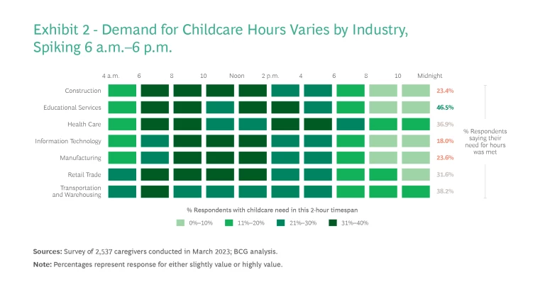 Another critical pain point relates to the time childcare is available. Only 29% of caregivers surveyed had childcare available for all the hours they needed. In industries such as IT, construction, and manufacturing, that percentage was below 25%. As shown in Exhibit 2, the hours in demand spike between 6 a.m. and 6 p.m., but can vary by industry. For instance, transportation and warehousing workers often require care starting at 4 a.m., while health care workers require childcare up until 8 p.m. Across the board, the ideal time for childcare generally starts at 6 a.m., but many providers do not open until 7 a.m. or 8 a.m. Caregivers must therefore find supplemental forms of care, including family members or even siblings, as noted in Ashley’s story. Some caregivers are forced to reduce their own working hours.