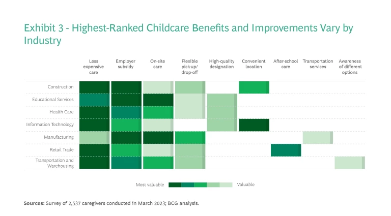 As shown in Exhibit 3, additional preferred benefits tend to vary by industry. Construction and IT workers want childcare providers that are in more convenient locations, such as highly trafficked areas. Manufacturing, construction, retail trade, and transportation and warehousing employees value care that better accommodates their schedules, with flexible pick-up and drop-off options. Furthermore, educational services, health care, and IT workers emphasize the need for designated high-quality childcare providers.