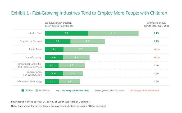 Notably, the two fastest-growing industries, health care and educational services, predominantly employ women: 73% and 69%, respectively. They tend to have the highest share of employees seeking childcare, as more than half of their combined 30 million employees have children below age 18 (see Exhibit 1).