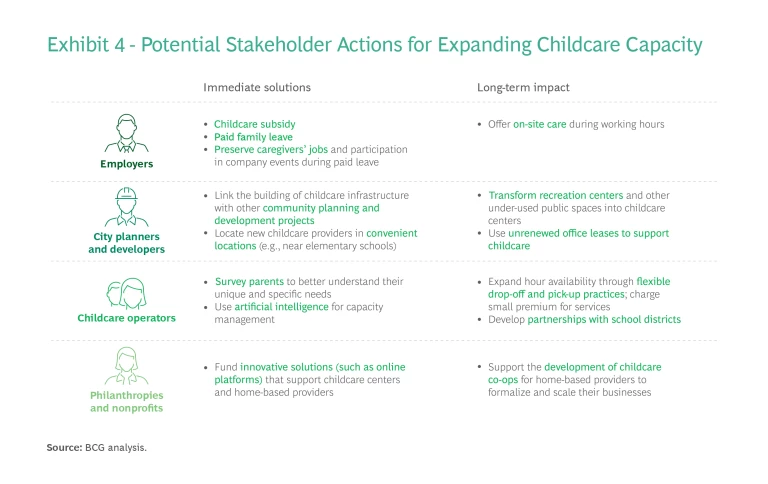 While everyone can play a role, five actors are central to building the childcare ecosystem. State and local governments, employers, city planners and developers, childcare operators, and philanthropies and nonprofits can all take steps toward improvement.