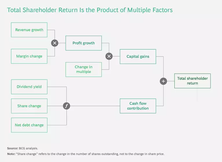 Multiple factors affect TSR. Readers of BCG’s Value Creators series may be familiar with our methodology for quantifying the relative contributions of the various components of TSR. (See the exhibit.) We use the combination of revenue (sales) growth and change in margins as an indicator of a company’s improvement in fundamental value. We then use the change in the company’s valuation multiple to calculate the impact of investor expectations on TSR. Together, those two factors determine the change in a company’s market capitalization. Finally, our model also tracks the distribution of free cash flow to investors and debt holders—in the form of dividends, share repurchases, and repayments of debt—to determine the contribution of free-cash-flow payouts to a company’s TSR.