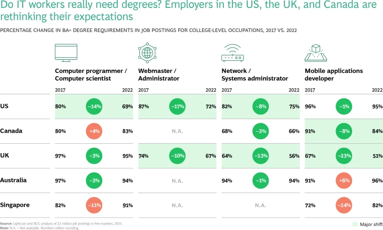 - In the US, only 69% of 2022 ads for computer programmer or computer scientist roles asked for a degree, down 14% from 2017.