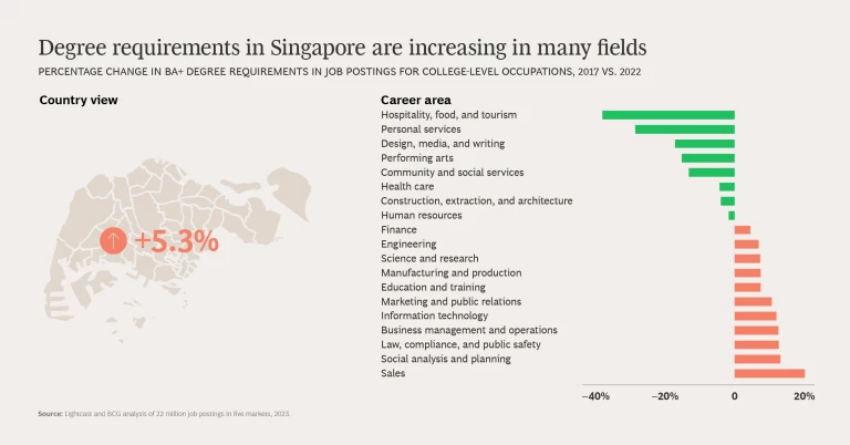 In Canada, the UK, Australia, and Singapore, there is a lesser shift and a different mix of career areas affected. In some areas, the requirement for a degree even increased from 2017 to 2022. This is particularly notable in Singapore, where the emphasis on degrees continues, even though the Singapore Institute of Management stated in March 2023 that “there are 2.5 vacancies for every unemployed person here in Singapore ... employers must look to widen the talent pool by going beyond the convention of looking at education qualifications.” Nonetheless, the Institute pointed out, one job advertisement seeking a driver of heavy vehicles included a requirement for a bachelor’s degree.