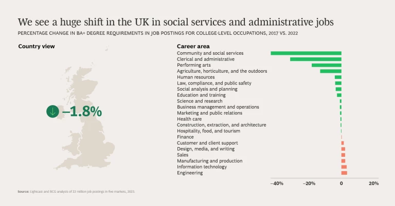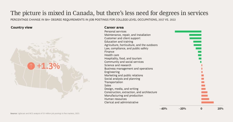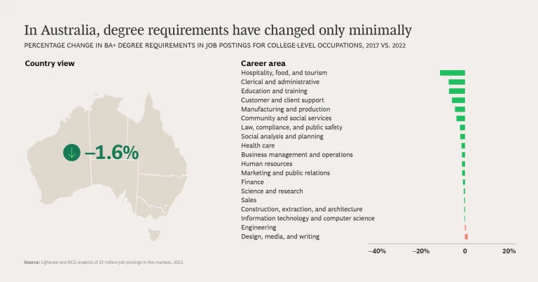 For some occupations, the need for degrees is decreasing across all five countries: in community and social services (for example, counselors and case workers), in health care (for example, support roles, such as lab technicians, hospital staff, and medical practice managers), and in hospitality, food, and tourism (for example, event planners and entertainment managers). Because the developed world faces major talent shortages in all three of these areas, it’s not surprising that employers are relaxing their expectations.