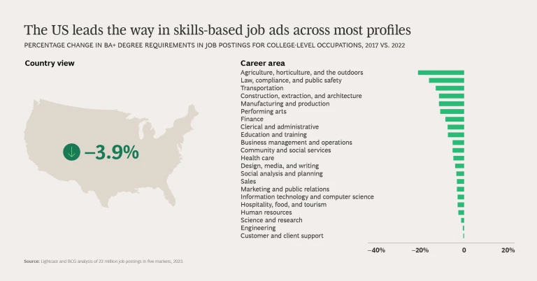 The US leads the shift to skills-based hiring, across career areas. Many large employers with a sizable US labor force are embracing the trend, among them Dell, Accenture, IBM, and Amazon. The US government is, too: In January 2021, the White House announced limits on the use of educational requirements when hiring for IT positions. Looking predominantly at college degrees, it said, “excludes capable candidates and undermines labor-market efficiencies. Degree-based hiring is especially likely to exclude qualified candidates for jobs related to emerging technologies.”