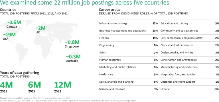 To conduct this analysis, Lightcast mined its dataset of millions of job postings. Lightcast collects postings from more than 65,000 online job sites, aggregating them, removing duplicates, and extracting data from the text to create a comprehensive, current portrait of labor market demand. This includes information on job titles, employers, industries, and regions, as well as required experience, education, and skill. The analysis is based on 22 million job ads across five countries in 2012, 2017, and 2022. We used machine learning to clean and standardize the data. See the exhibit below for more detail.