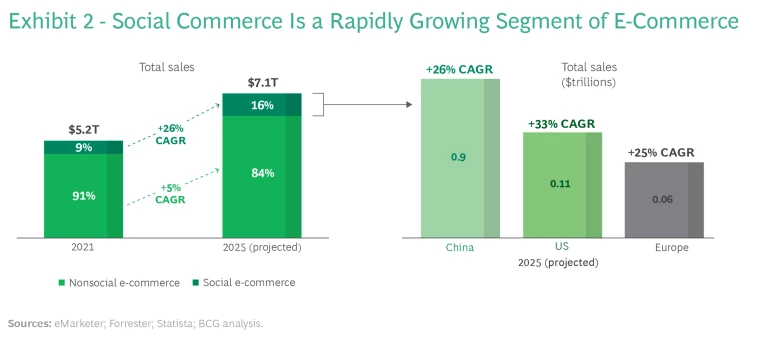 Social commerce has been a more recent phenomenon in the West; even so, between 2021 and 2025, transaction volumes in the US and Europe are expected to grow by 33% and 25%,