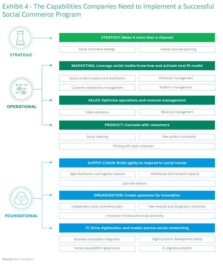 Strategic capabilities safeguard the long-term vision of the company and make sure the organization aligns the social-commerce strategy with the overall channel strategy. Social commerce is more than another sales channel—it is a shift in how a business operates, offering a more unified approach that brings together supply chain, marketing, sales, and customer interaction.