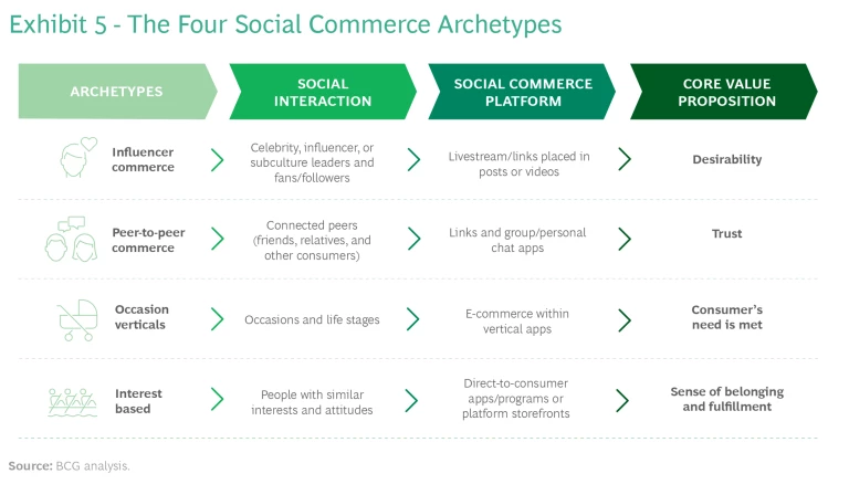 As Lizanne’s story shows, social commerce moves the selling model from the buyer finding the product to the product finding the buyer—leveraging personalization as the social-media algorithm learns from browsing behavior. Companies, however, have to find their own sweet spot and determine the best social-commerce models for their businesses, brands, products, and operational capabilities. Later in this report we will look at four possible social-commerce archetypes for companies to consider.