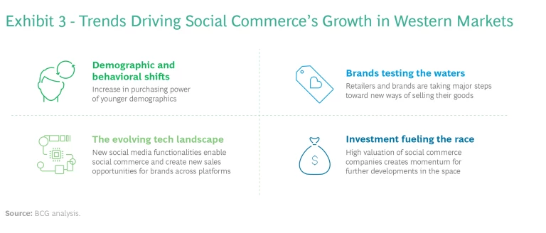 There are four primary reasons why social commerce is headed for accelerated growth in Western markets, and they closely parallel the dynamics behind its popularity in China. (See Exhibit 3.) First, purchasing power is expanding for social-network users from ages 18 to 24, who are most inclined to engage in social shopping experiences. Second, technology providers are investing heavily to integrate commercial and social features, blurring the line between the two. Moreover, tech firms are abandoning the “walled garden” approach—in which they mainly provide proprietary, closed platforms for commercial activities—and are joining forces with specialized service providers to reach wider audiences. For instance, YouTube has introduced live shopping programs and an “explore” tab with shoppable content in partnership with the e-commerce platform Shopify.