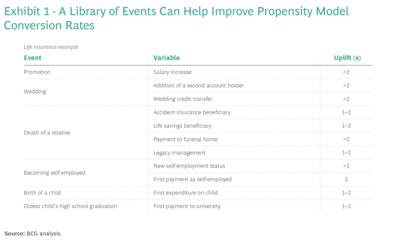 Banks can also complement static propensity models with dynamic models, such as a library (a precompiled list) of events. We’ve seen some events can increase lead conversion by 10% to over 130%, though the amount of the increase depends on the insurance product. (See Exhibit 1.)