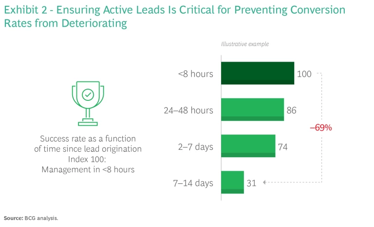 Build a seamless omnichannel journey. The longer it takes to process a lead, the less successful it is likely to be. (See Exhibit 2.) This is especially true for leads linked to customer events, such as getting married or having a child. If the bank relationship manager (RM) is not able to respond to a lead while it is still warm, there needs to be a call center, home-banking webpage, mobile, or another channel that the bank can steer the lead to. That way, the bank can guarantee a seamless omnichannel journey and avoid losing a sales opportunity. If the bank manages the lead 48 hours after receiving it instead of two weeks later, it can prevent the conversion rate from dropping significantly.