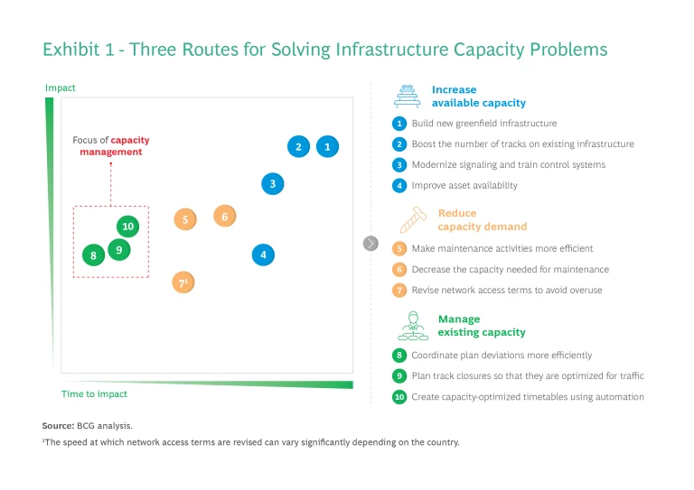 Rail infrastructure managers have three ways to solve infrastructure capacity issues. (See Exhibit 1.)