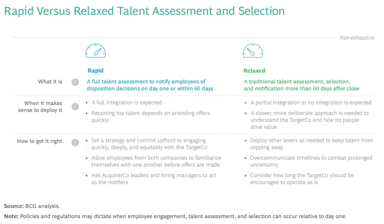 Finally, in cases where the TargetCo employees will be integrated, the AcquirerCo should develop a timeline for conducting a detailed talent assessment, extending offers, and realizing outcomes, along with the supporting HR assessment and offer processes. Often, the acquirer first chooses between two talent assessment approaches: rapid and relaxed. (See the exhibit.)