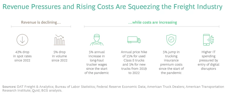 Freight transportation spot rates and volumes are dropping at the same time that labor, vehicle, insurance, and IT costs are on the rise. Together, these forces have created a big squeeze on freight and logistics companies. (See the exhibit.)