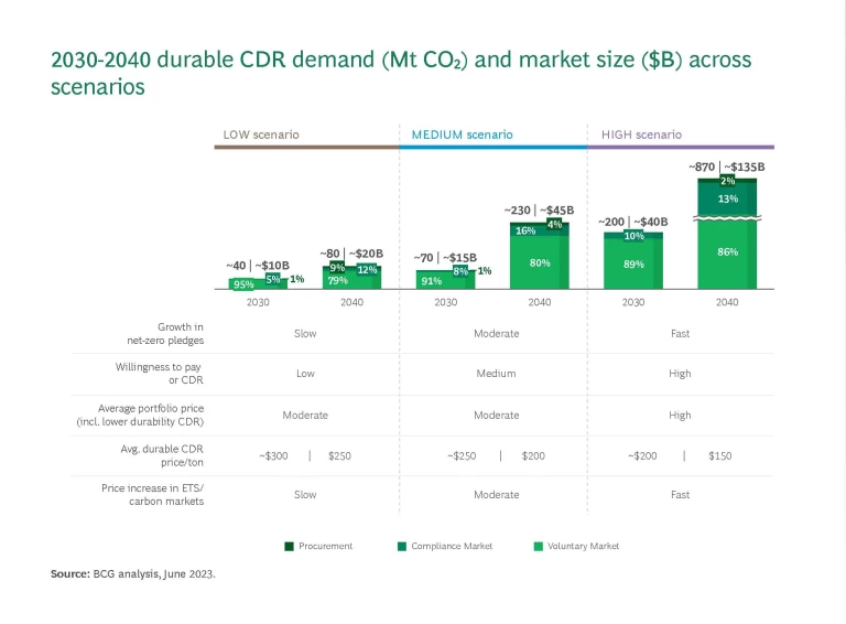 We expect a robust demand for durable CDR in 2030–2040 across both voluntary and non-voluntary carbon markets. Voluntary markets reflect demand across companies worldwide under Net Zero pledges, while non-voluntary markets account for demand across carbon compliance markets, CO2 removal mandates, and direct government procurement initiatives.
