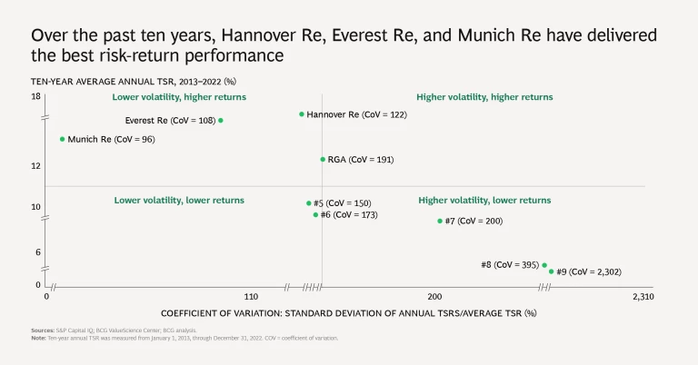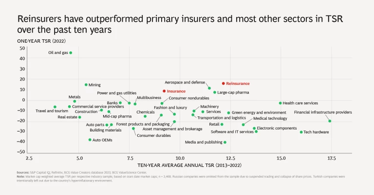 Despite some strong headwinds, reinsurance has delivered top-of-the-pack shareholder returns over the past five and ten years, outperforming the rest of the insurance industry—and, recently, most other sectors as well. Reinsurance annual total shareholder returns (TSR) averaged 10% and 12.2% for the past five and ten years, respectively, compared with 3.9% and 9.4% for the insurance industry as a whole. Across the more than 30 sectors for which BCG tracks value creation, only oil and gas delivered higher TSR over the past year.