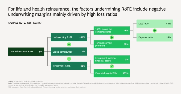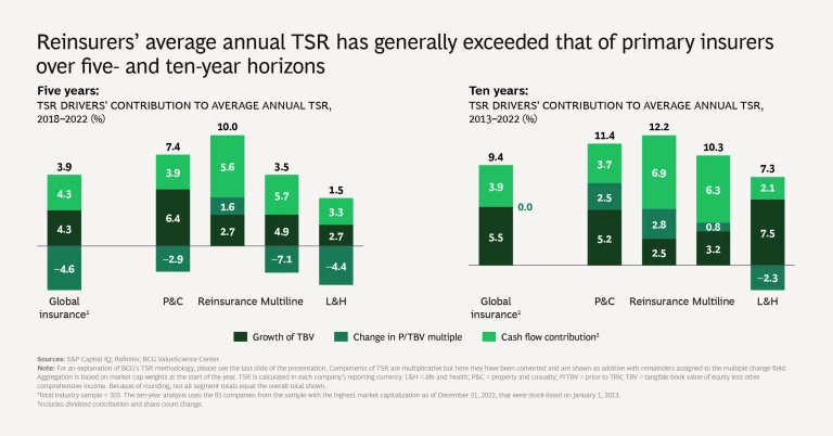 The main driver of reinsurance TSR has been companies’ use of cash flow to sustain high dividends and repurchase shares. Our analysis of ten-year TSR performance in insurance shows that the two most important factors are tangible book value (TBV) growth and cash flow. TBV growth accounts for about 60% of TSR and cash flow 30%. (The other 10% is multiple expansion or contraction.) Reinsurers lag in TBV growth. From January 1, 2013, to December 31, 2022, reinsurance TBV growth was 2.5%, compared with an average of 5.5% for the rest of the industry—property and casualty (P&C), life and health (L&H), and multiline. Cash flow made up the shortfall. Using cash flow to deliver TSR works well when times are good, and reinsurers in the past have had significant reserve buffers. But a recent run of tough years, particularly 2017 through 2022, has depleted these coffers.