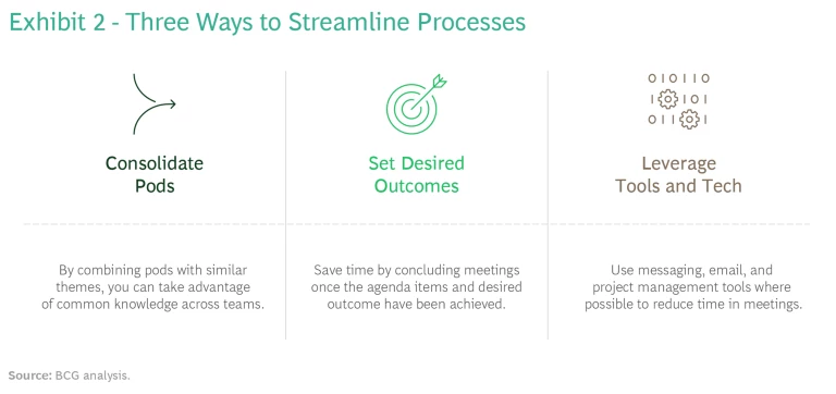 - Taking Advantage of Tools and Technology: Instead of live meetings for everyone, the organization could shift some discussions to instant messaging (Slack, Teams) and use emails and Trello boards to keep everyone in sync. Pods can also integrate calendar and project management tools to track workloads efficiently and anticipate bottlenecks.