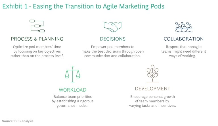 The good news is that organizations have numerous ways to overcome their implementation challenges and achieve the benefits of this new way of working. In this second article in our series on agile marketing organizations, we highlight several recommendations to ease and accelerate the transition to agile marketing pods and away from traditional team structures. (See Exhibit 1.)
