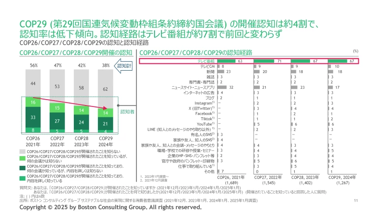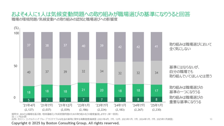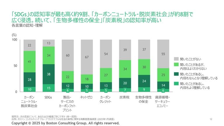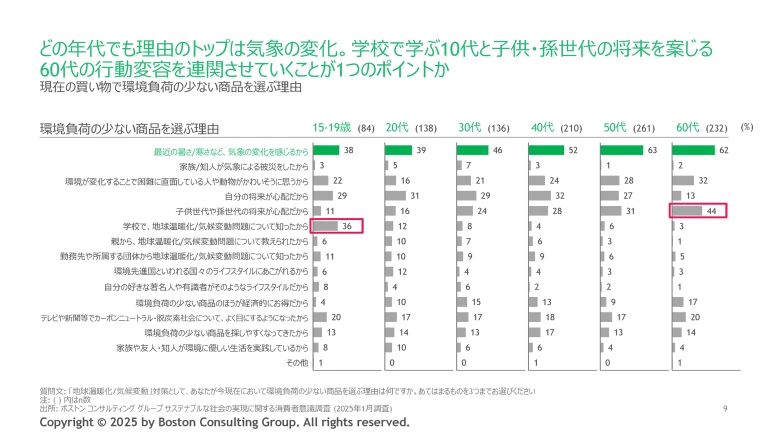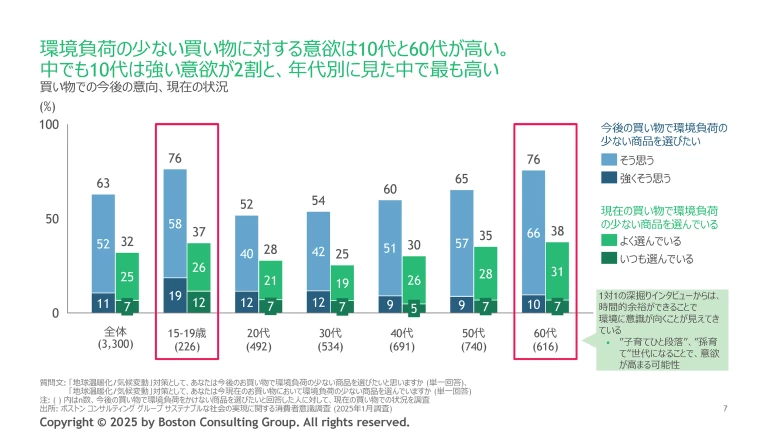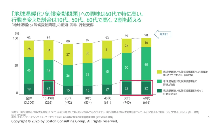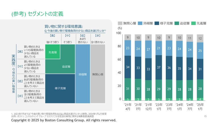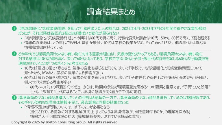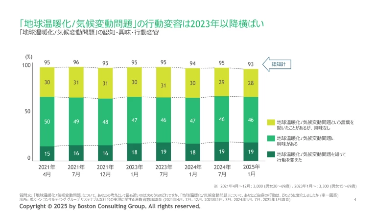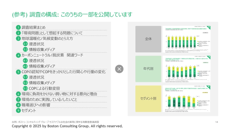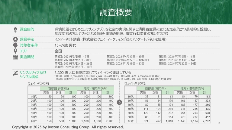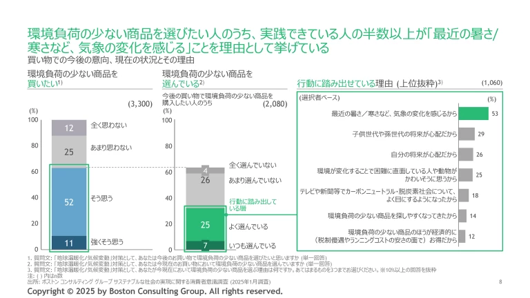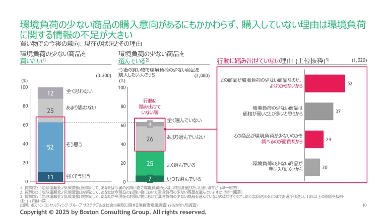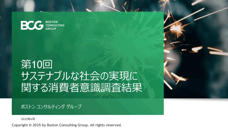 BCGは、サステナブルな社会の実現に関する消費者意識や購買行動の変化を理解するために定点調査を行っています。第10回調査は、15~69歳の日本の消費者を対象に、2025年1月に実施しました。