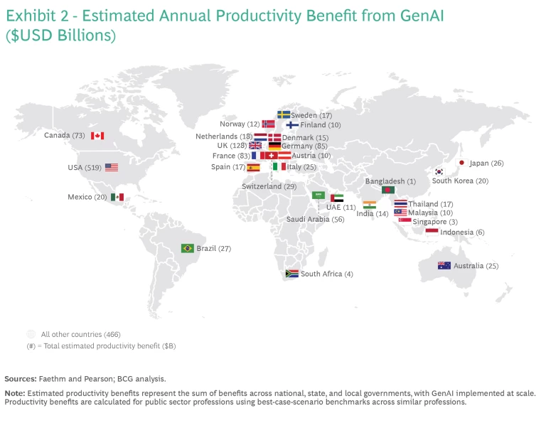 BCG estimates the productivity gains of GenAI for the public sector will be valued at $1.75 trillion per year by 2033. (See Exhibit 2.) Our estimate on the impact of GenAI is based on using inputs from Pearson-Faethm modeling. It reflects productivity gains across all national, state or provincial, and local governments and across all domains such as legislative, administrative, courts, health care, education, transportation, and security.